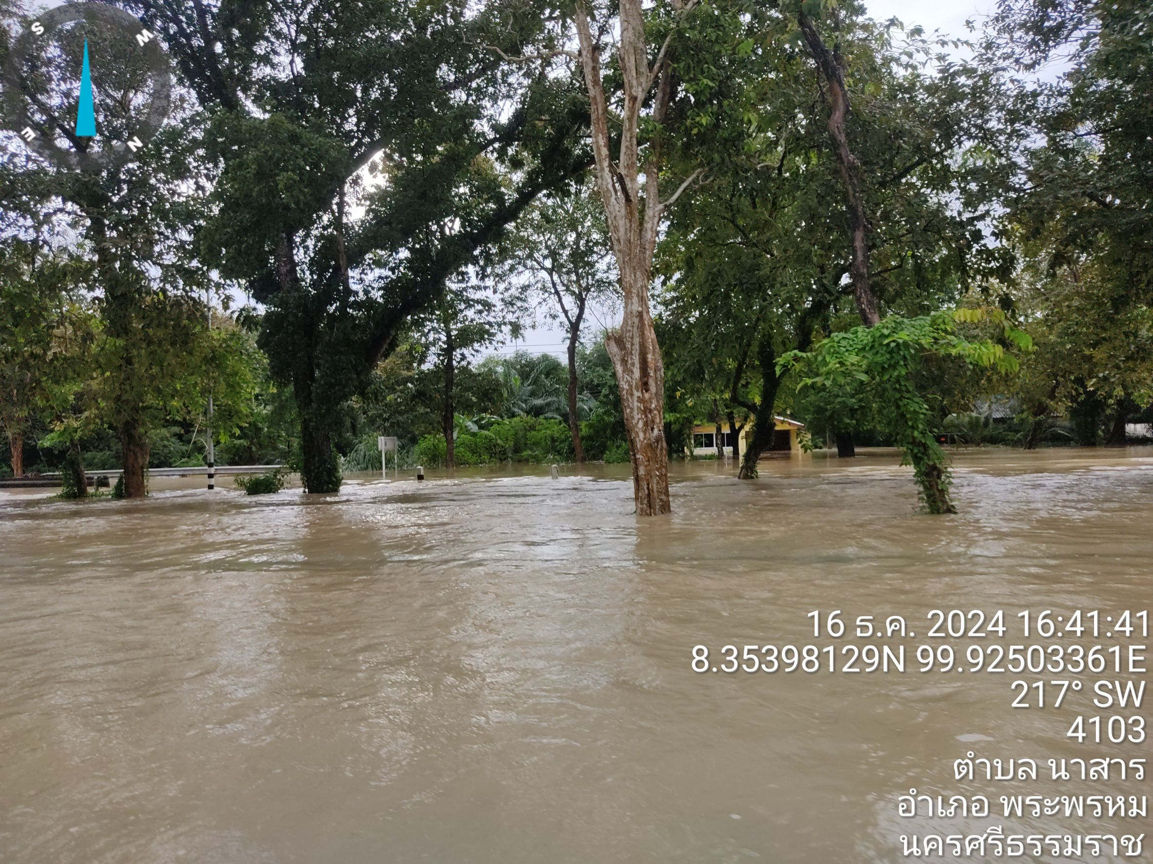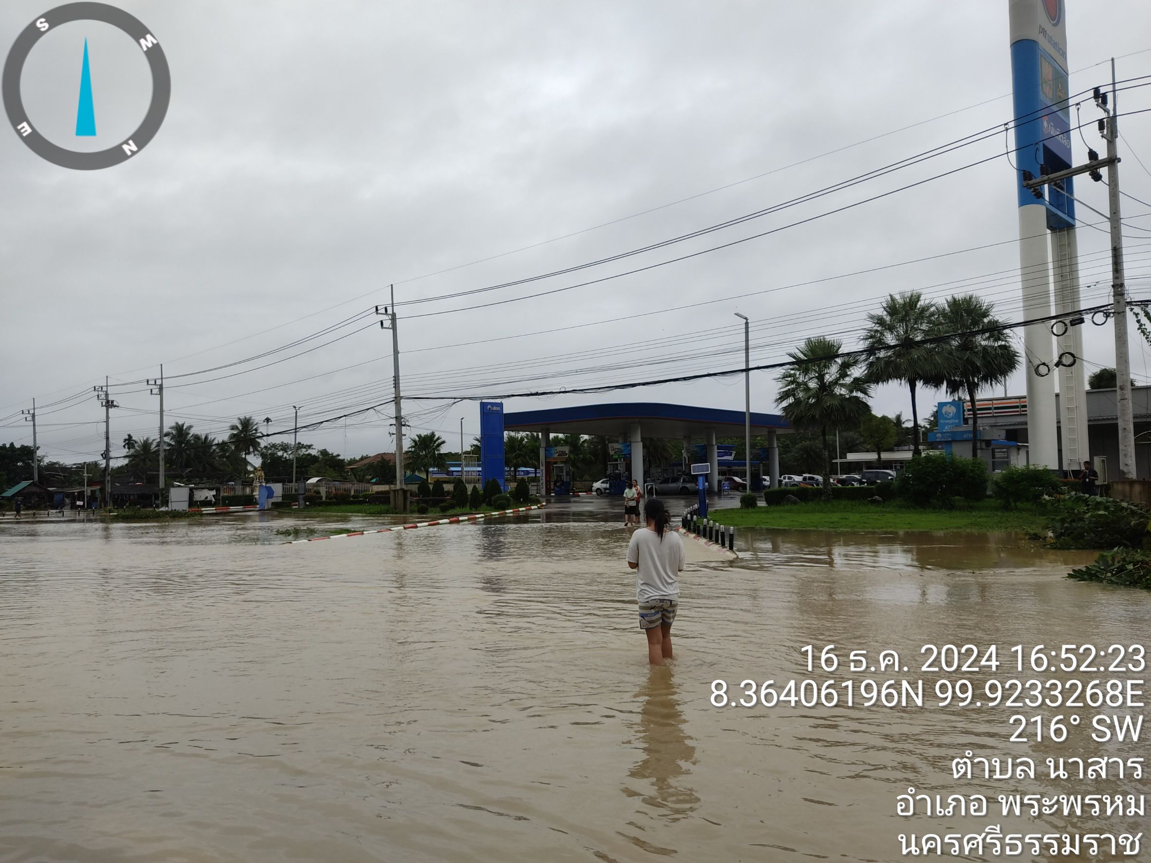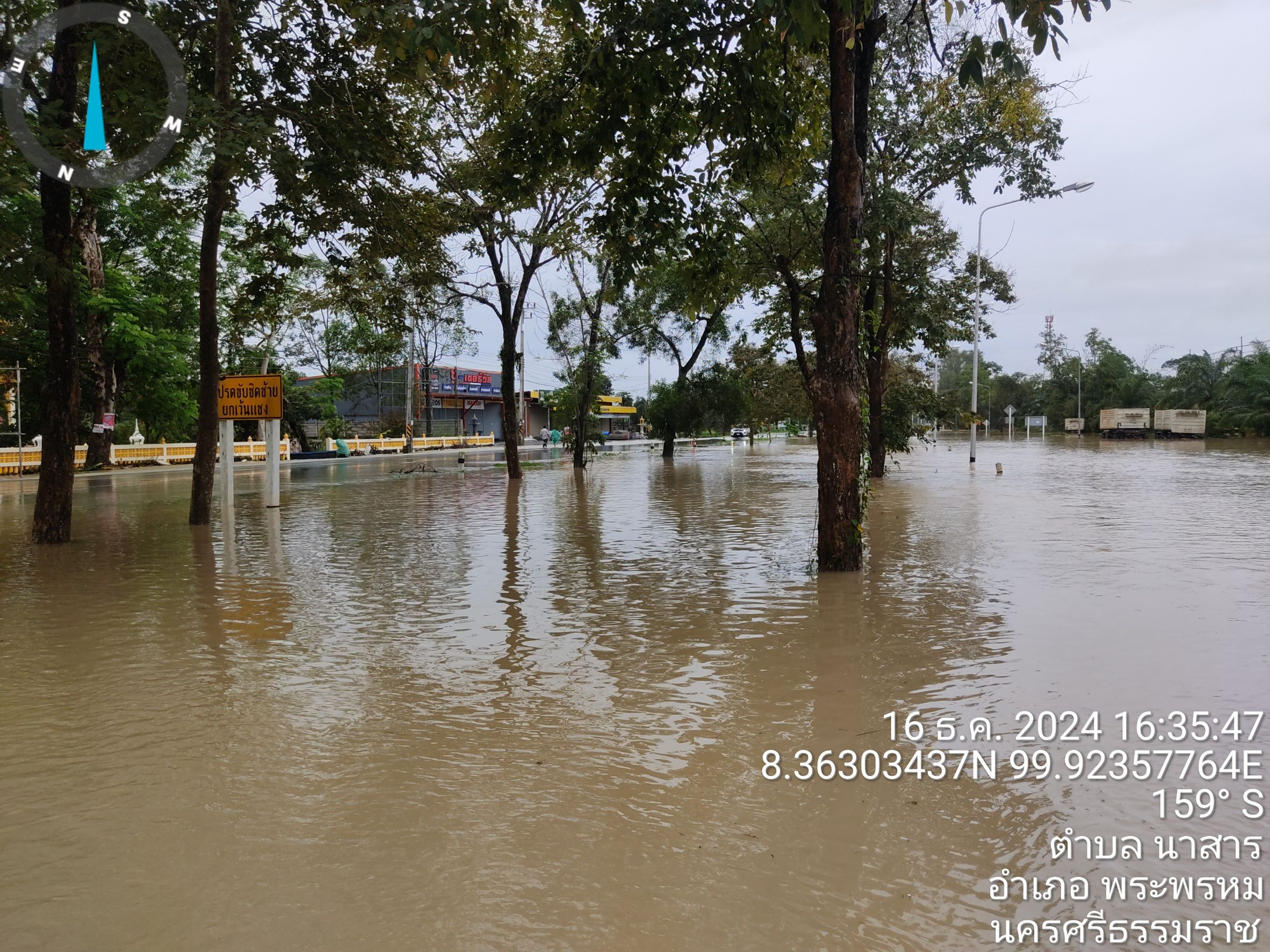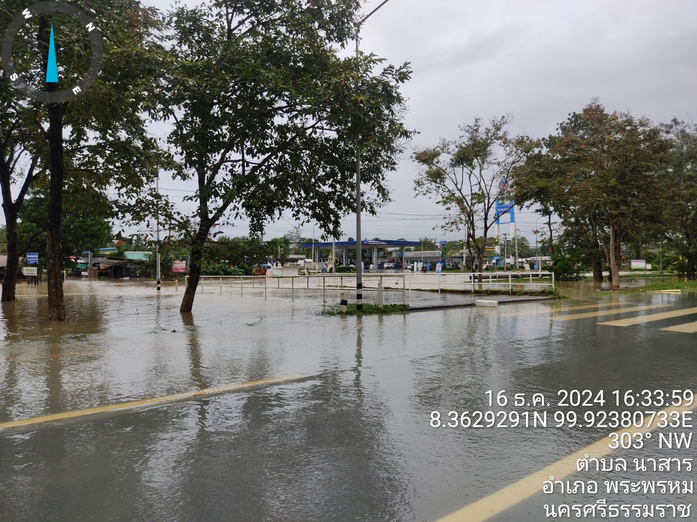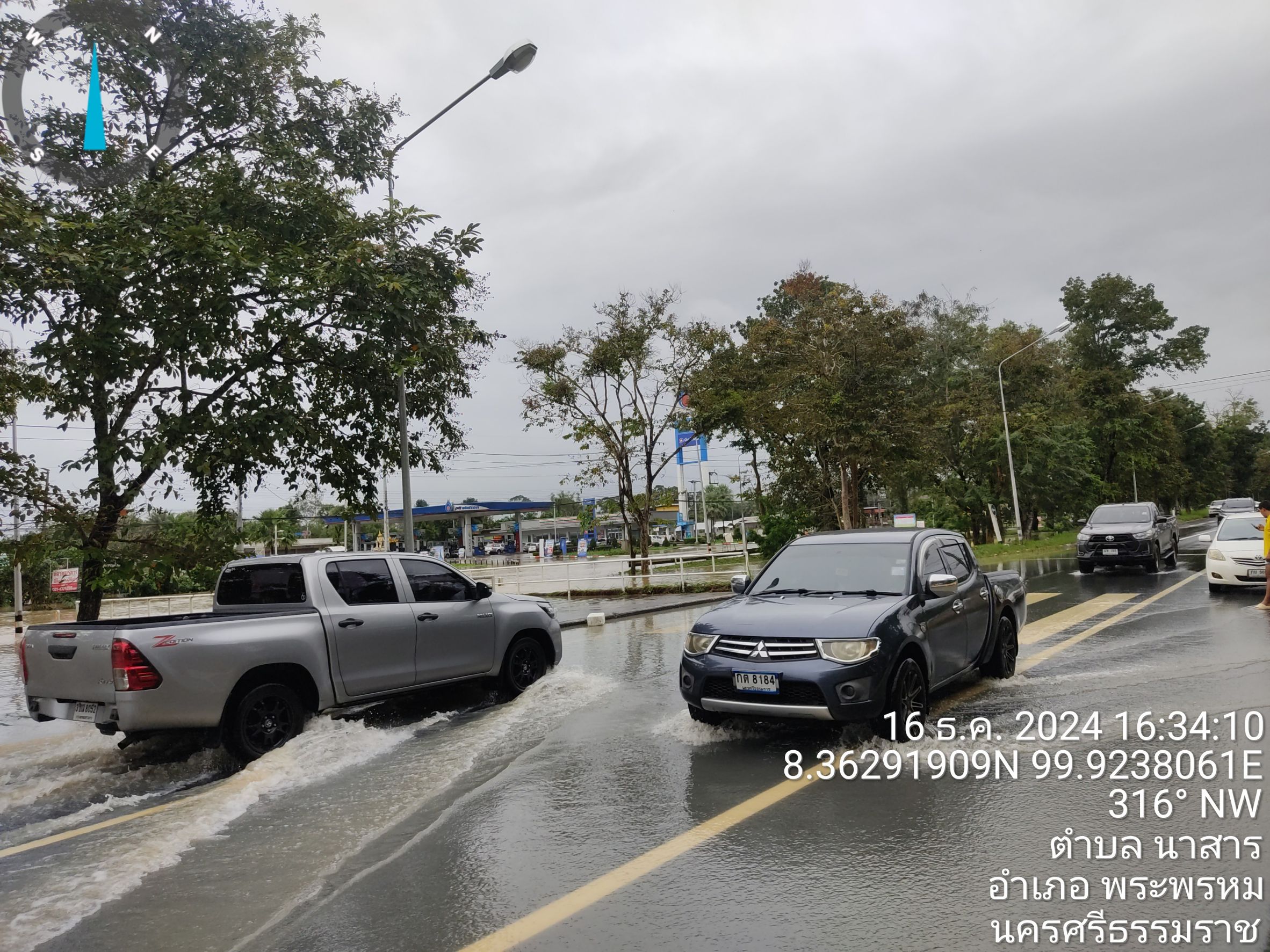 16 ธันวาคม 2567 16.30 น. โดยประมาณ นรสิงห์ 01 E29YJJ ออกตรวจสอบสถานการณ์น้ำบริเวณปั๊ม ปตท.นาสาร อ.พระพรหม จ.นครศรีธรรมราช และพื้นที่โดยรอบ พบว่ายังคงมีน้ำท่วมขังผิวการจราจร รถเล็กยังไม่สามารถสัญจรได้