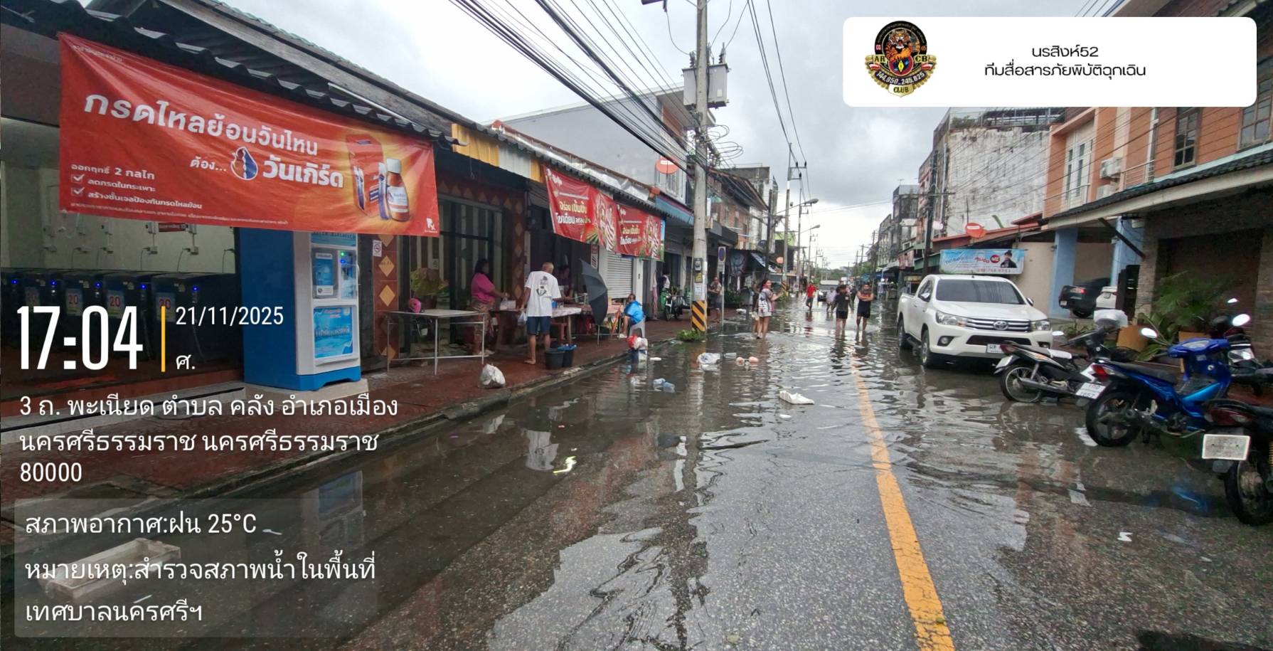 November 21, 2025 – The Norasingh HAM Club of Nakhon Si Thammarat received the latest flood situation report within the Nakhon Si Thammarat City Municipality area at 4:30 PM (16:30 hrs). Norasingh 52 surveyed the areas around Phra Ngoen Road, Phutthumi Road, Khu Khwang Market, the road in front of Robinson Ocean Department Store, and nearby areas.