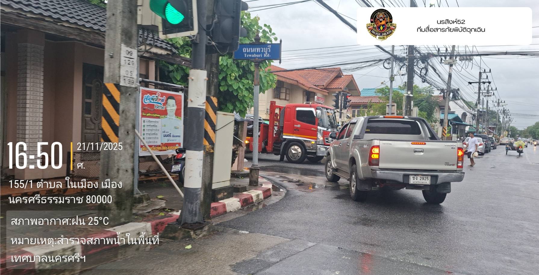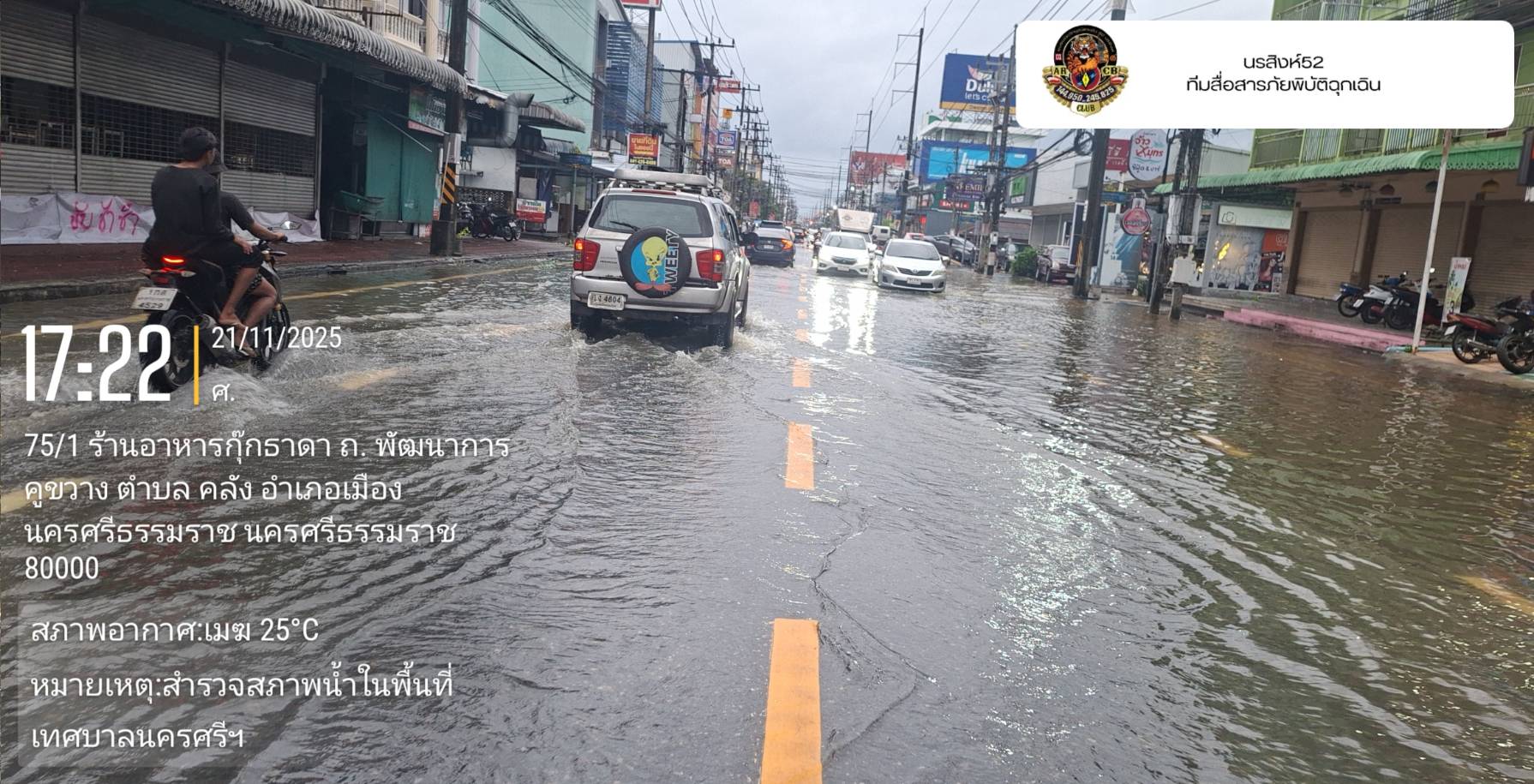นรสิงห์ 52 ลงพื้นที่สำรวจเย็นนี้ ถนนสายหลักเมืองคอนฯ ยังมีน้ำท่วมขัง เตือนรถเล็กสัญจรระมัดระวัง