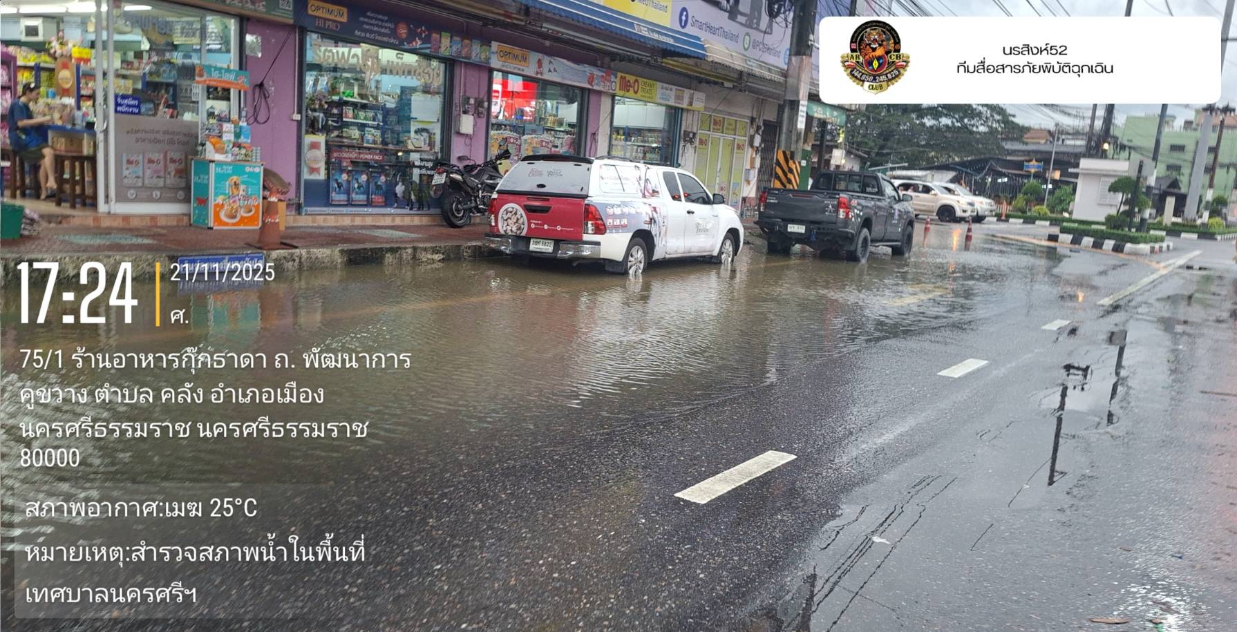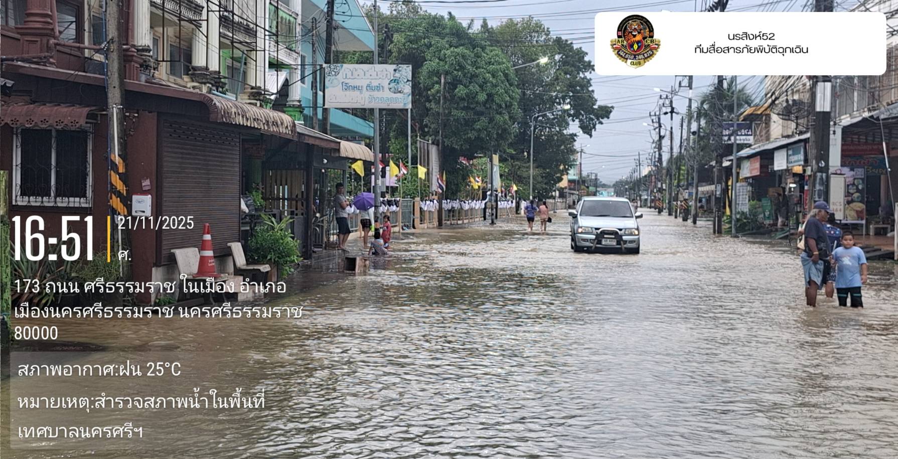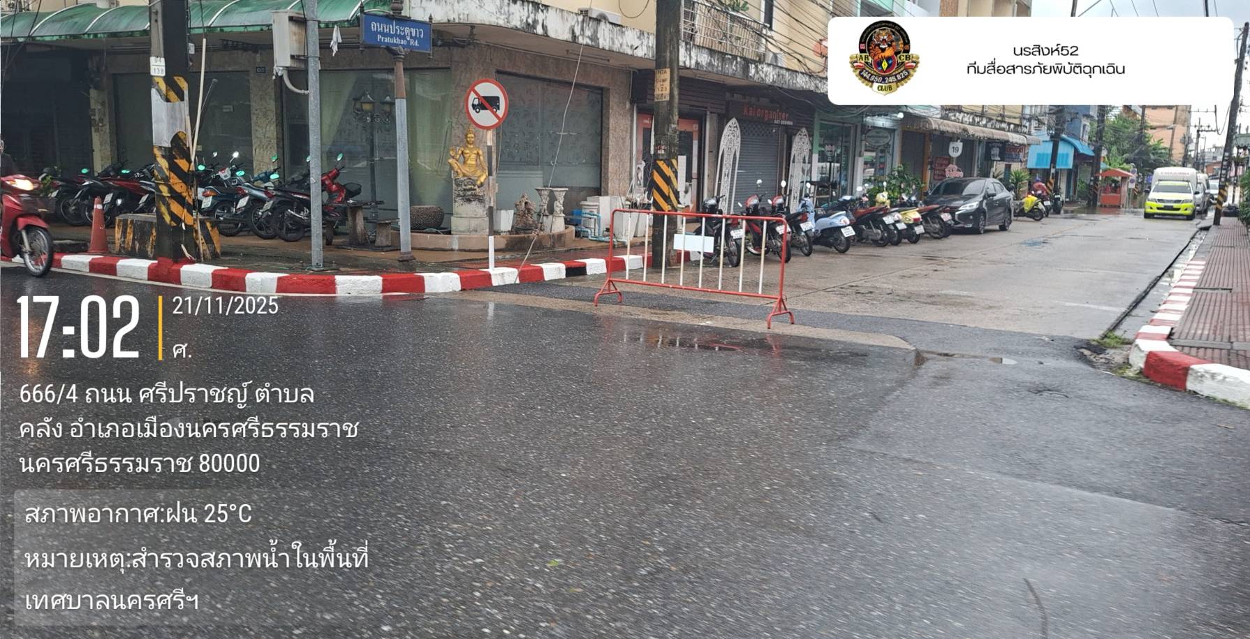 November 21, 2025 – The Norasingh HAM Club of Nakhon Si Thammarat received the latest flood situation report within the Nakhon Si Thammarat City Municipality area at 4:30 PM (16:30 hrs). Norasingh 52 surveyed the areas around Phra Ngoen Road, Phutthumi Road, Khu Khwang Market, the road in front of Robinson Ocean Department Store, and nearby areas.