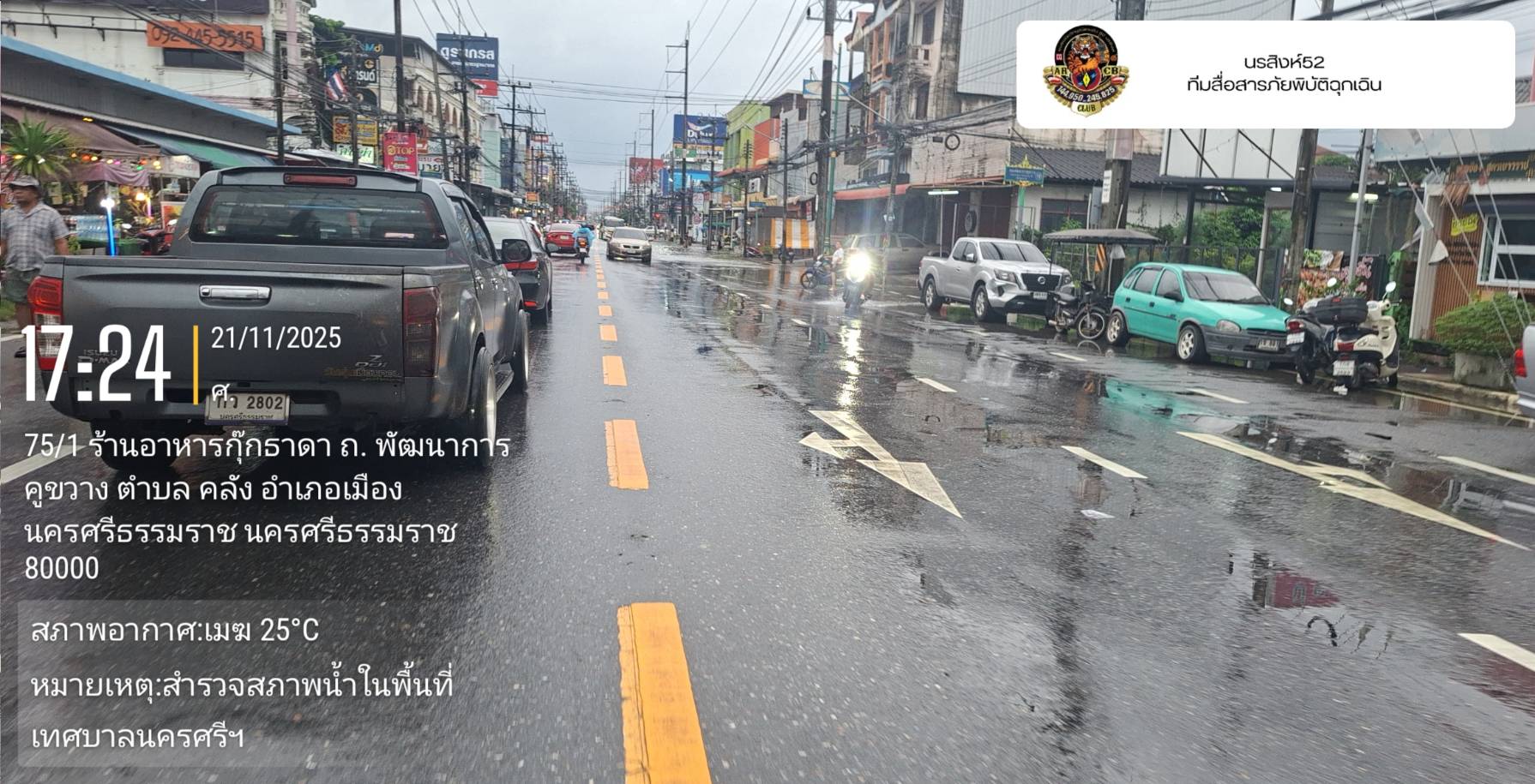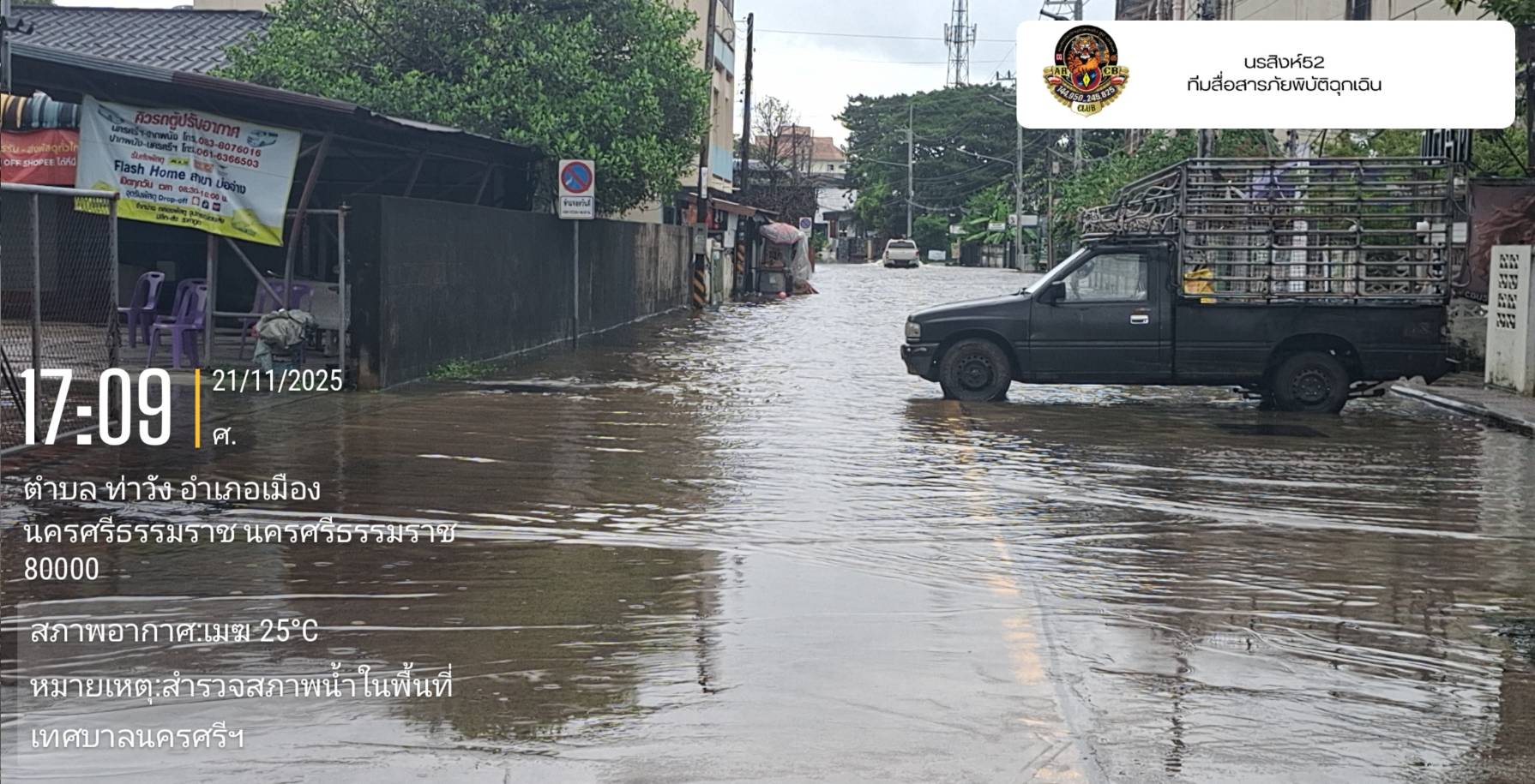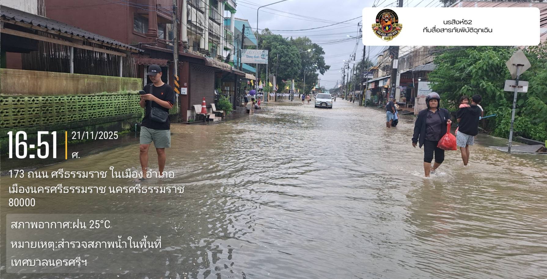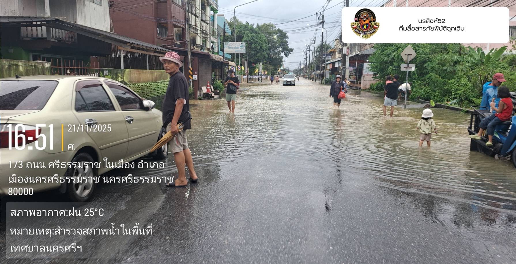 November 21, 2025 – The Norasingh HAM Club of Nakhon Si Thammarat received the latest flood situation report within the Nakhon Si Thammarat City Municipality area at 4:30 PM (16:30 hrs). Norasingh 52 surveyed the areas around Phra Ngoen Road, Phutthumi Road, Khu Khwang Market, the road in front of Robinson Ocean Department Store, and nearby areas.