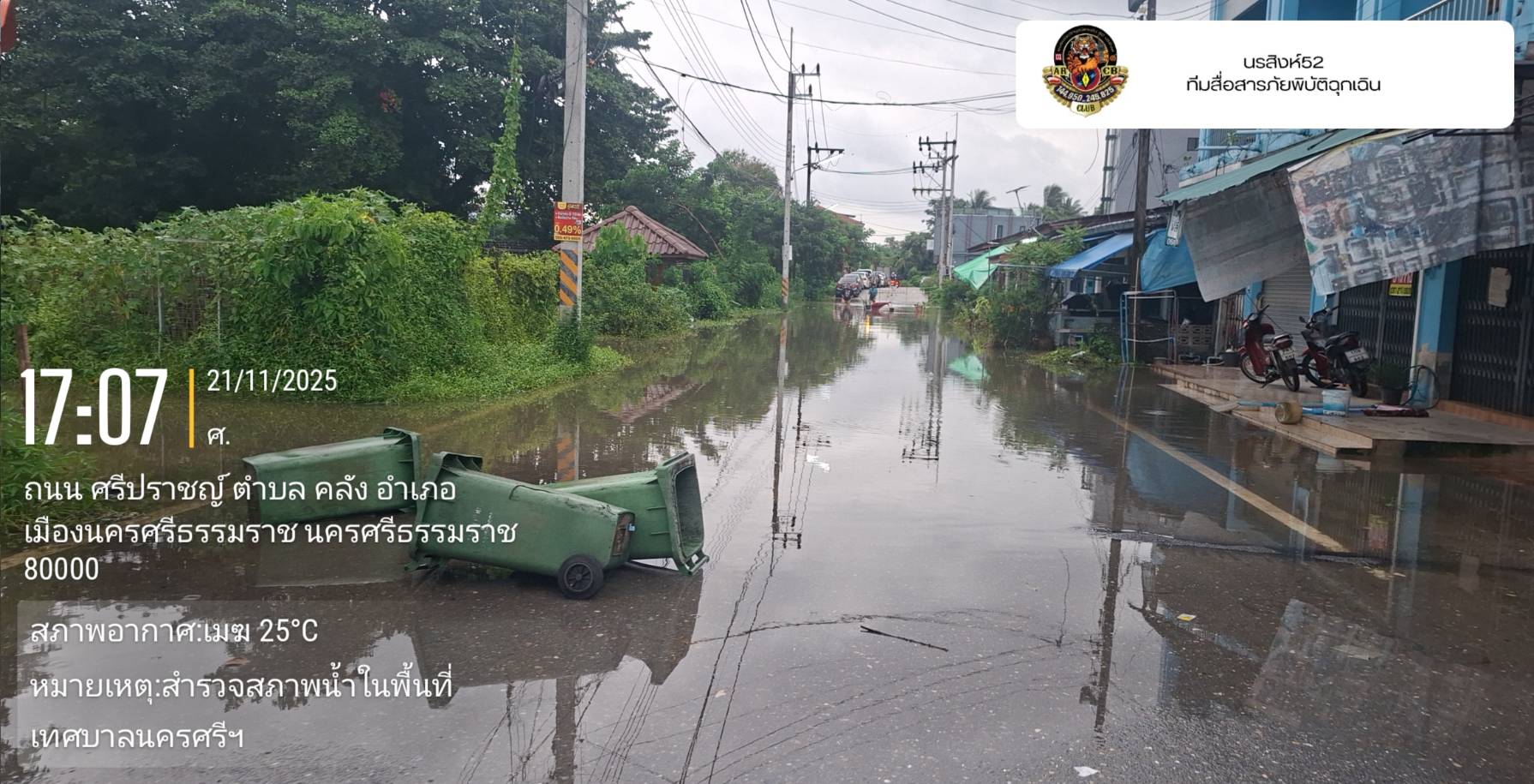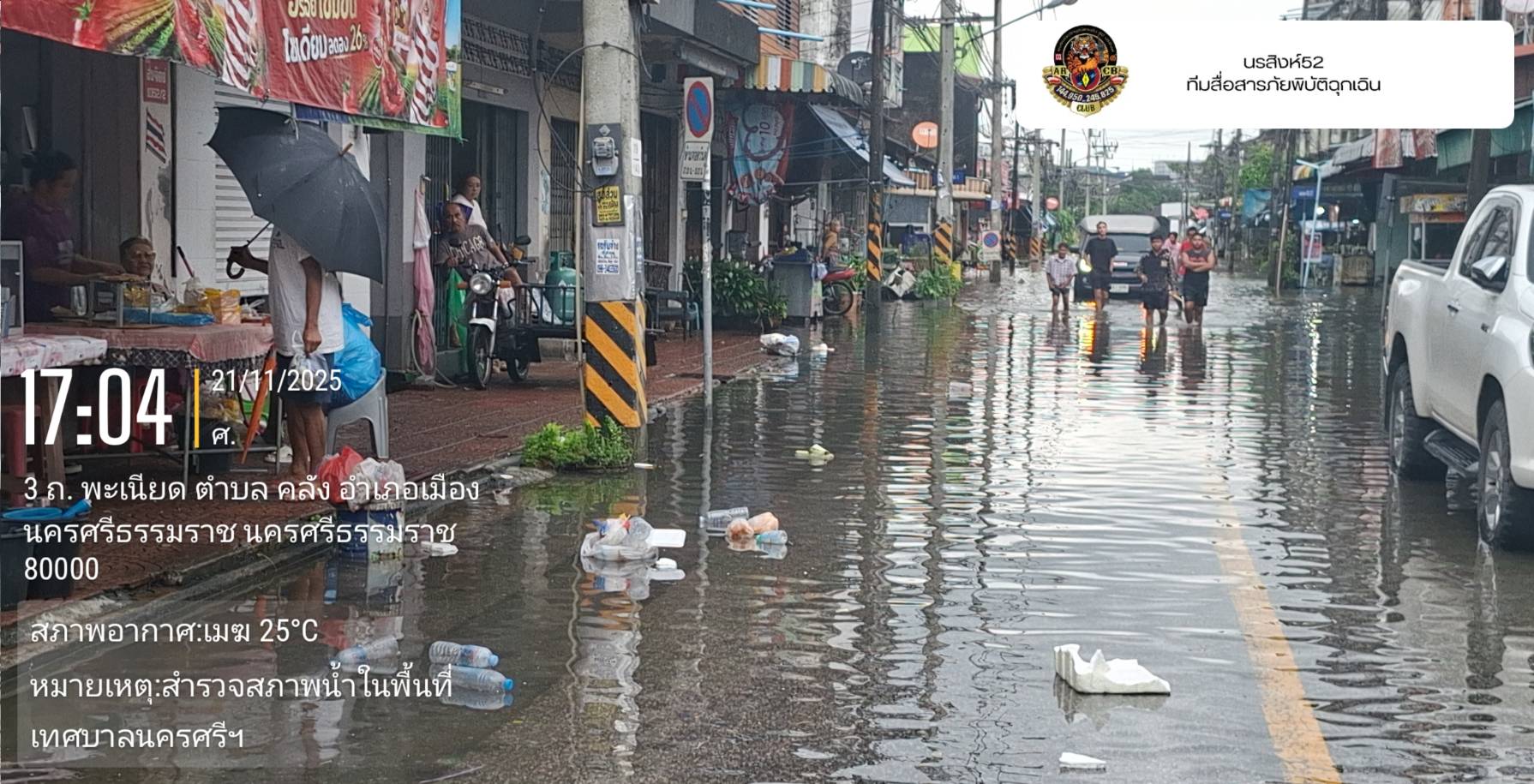 21 พฤศจิกายน 2568 – ชมรมวิทยุสมัครเล่น ซีบีนรสิงห์ นครศรีธรรมราช ได้รับรายงานสถานการณ์อุทกภัยล่าสุดในพื้นที่เขตเทศบาลนครนครศรีธรรมราช เมื่อเวลา 16.30 น. ที่ผ่านมา นรสิงห์ 52 ได้ลงพื้นที่สำรวจพื้นที่บริเวณถนนพระเงิน, ถนนพุทธูมิ, ตลาดคูขวาง, ถนนหน้าห้างโรบินสันโอเชี่ยน และพื้นที่ใกล้เคียง